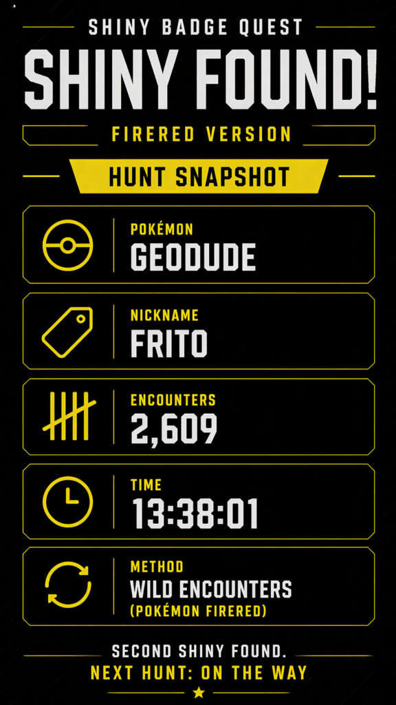 The more I thought about it, the more I realized I couldn’t build this quest around quick wins. The odds in Pokémon FireRed and LeafGreen are 1 in 8192, but that number isn’t a promise, it’s a suggestion at best. I’ve seen hunts go double, even triple over odds. Sometimes, the game just decides it’s not your day.