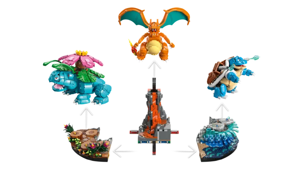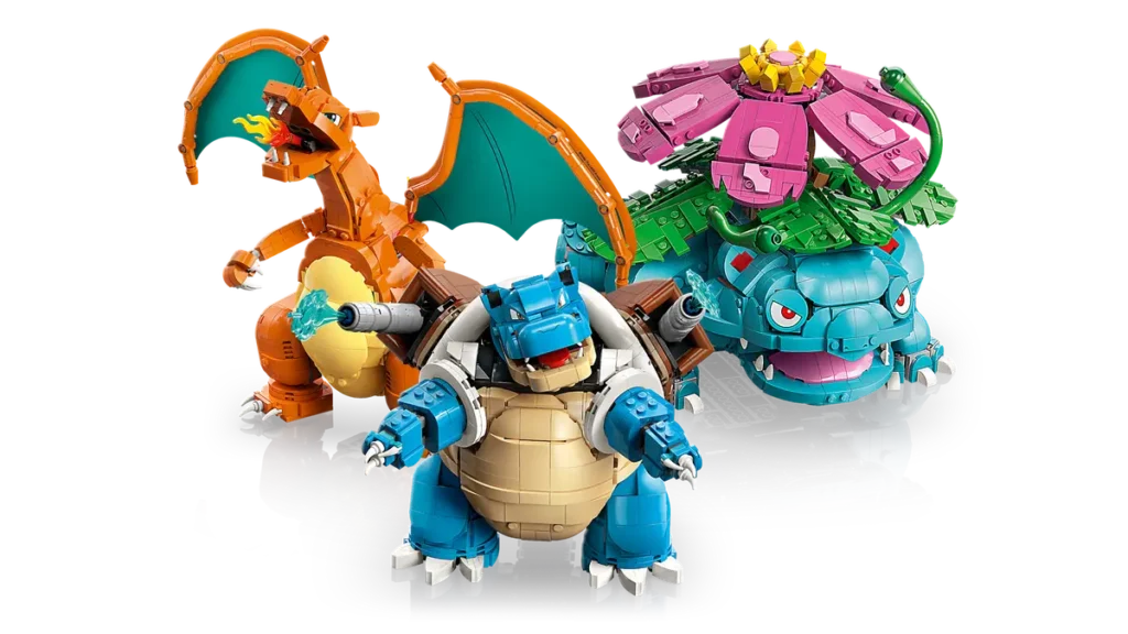The centerpiece of the lineup is Venusaur, Charizard, and Blastoise (Set #72153). With an astonishing 6,838 pieces, this massive build is among the largest LEGO sets ever produced. All three Pokémon are fully poseable, and the set carries a premium price tag of $649.99 USD, clearly positioning it as a high-end collector’s item.